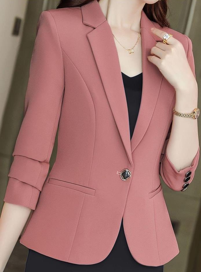 The cropped blazer features a shorter length that highlights the waist and creates a fresh, fashionable look. It is ideal for pairing with high-waist trousers, skirts, or dresses.