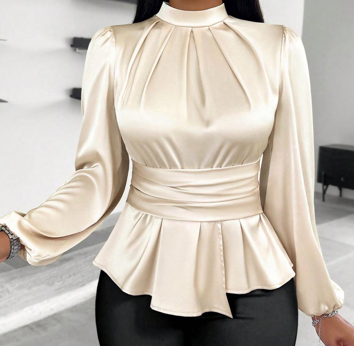 The peplum blouse features a fitted waist with a flared hem, enhancing curves while maintaining comfort. It adds sophistication and charm to both professional and evening outfits.