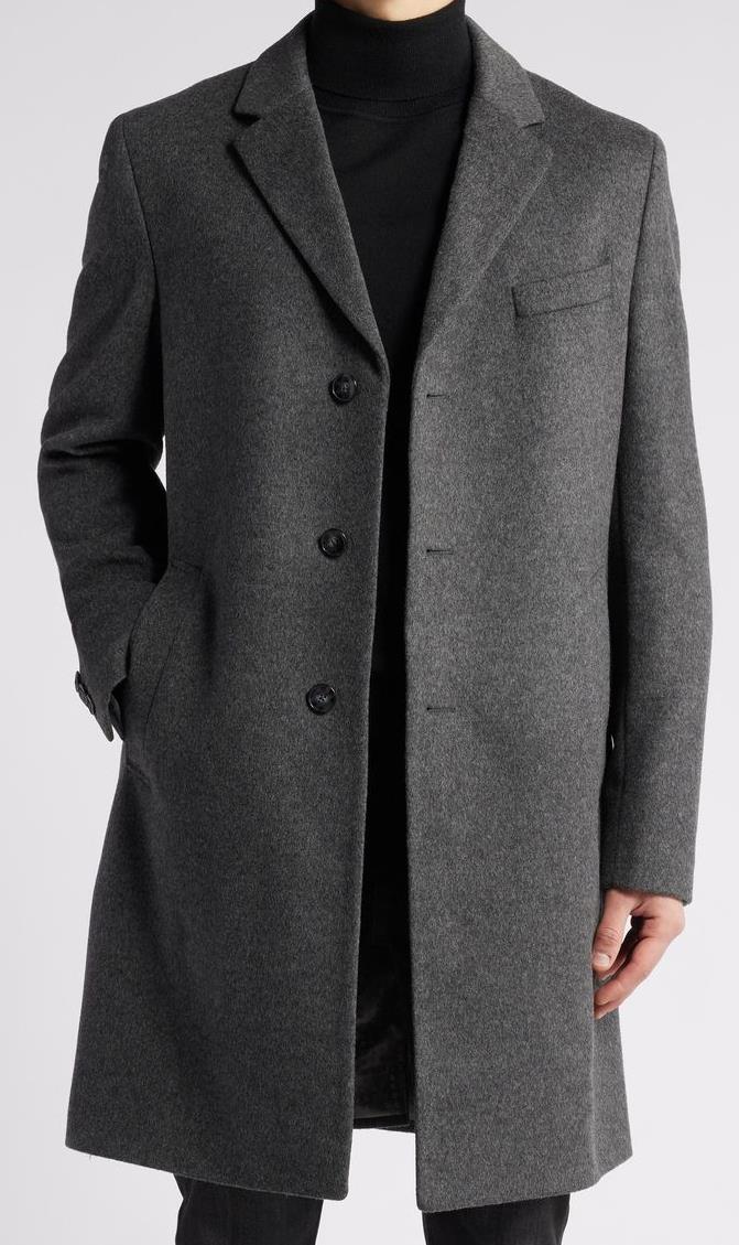 The wool overcoat is made from premium wool fabric, providing excellent insulation and durability in cold weather. It offers a clean, sophisticated appearance suitable for formal and everyday wear.