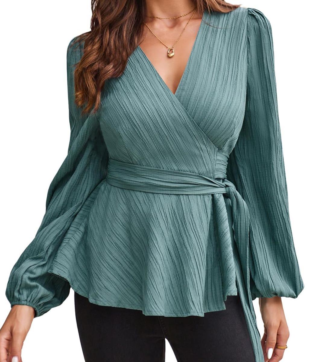 The wrap blouse features a wrap-front design that enhances shape while allowing adjustable comfort. It creates a soft, elegant look suitable for both professional and relaxed settings.